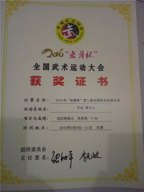 9月9日至11日,2016年“宏舜杯”第二届全国武术运动大会在天津市举行,我校教师于东代表陕西省武术队参赛并取得了优异成绩,荣获“武术段位制项目展示优秀奖”。